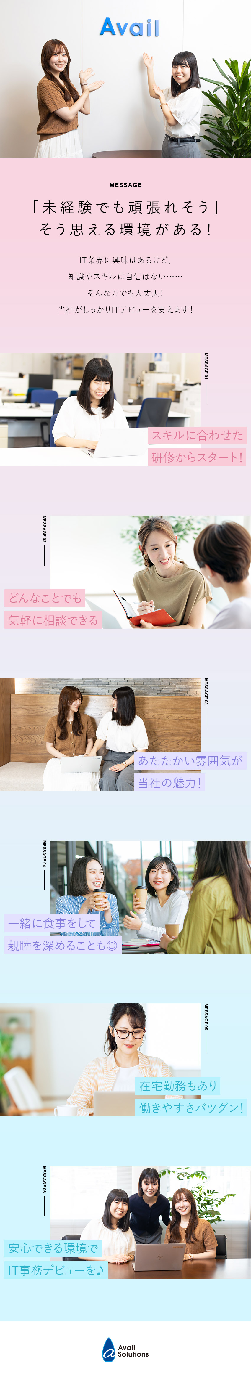 IT業界や事務の経験がなかったのですが、「育成が手厚くて、未経験でも頑張れそう!」と思って入社を決めました。もちろん、入社後もいつでも上司や先輩に相談できるので、安心して成長していけました。
