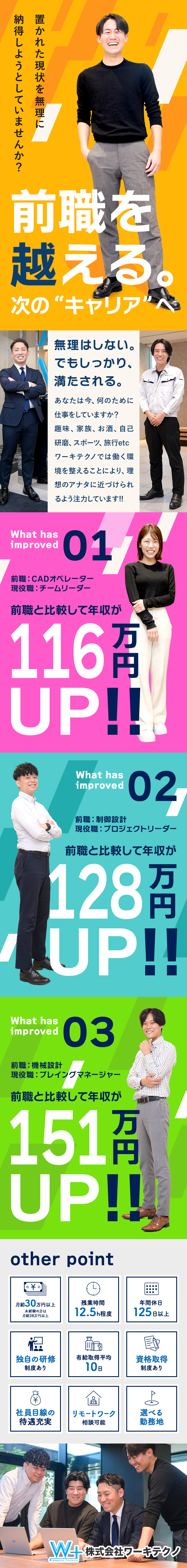 クライアントの多くは上場企業で、業績も順調に伸び売り上げは右肩上がり。未経験から設計職へスキルアップする方が続出するなど。その秘訣は、ワーキテクノに根付いた考え方があるからだそうです。それは社員一人ひとりの5年、10年後のキャリアを考え将来必要なスキルは何?その為に今、どんなプロジェクトで経験を積むべきなのか真剣に考える事だそう。もちろん社員の希望を無視することはないそうで、年齢や周りの環境など様々な要因によって状況が変化する中、柔軟に対応できるように日々のコミュニケーションを一番大切にしているとのこと。一人ひとりに向きあっているからこそ業績も社員数もどんどん伸びているんですね。