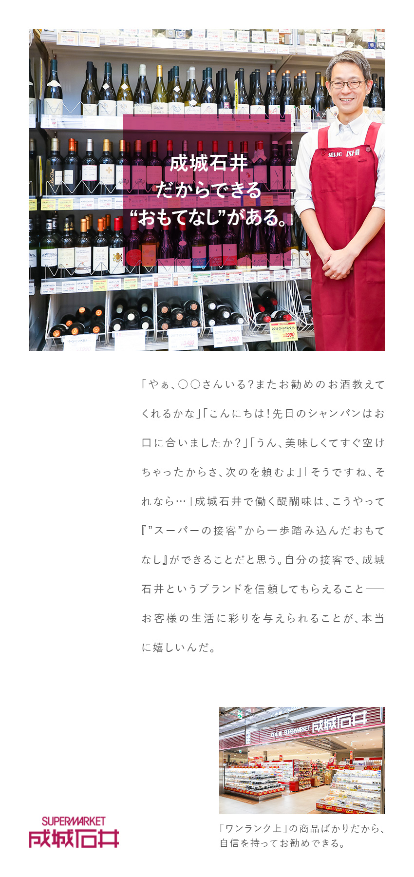 「実感として、成城石井ではお客様とスタッフの距離感が近いと感じることが多いです。一歩踏み込んだ"接客"ができるのは成城石井ならではの魅力。お酒好きのお客様に1本おすすめして、後日『あれ美味しかったよ!他のおすすめも教えて』と言っていただけた時は嬉しかったですね。