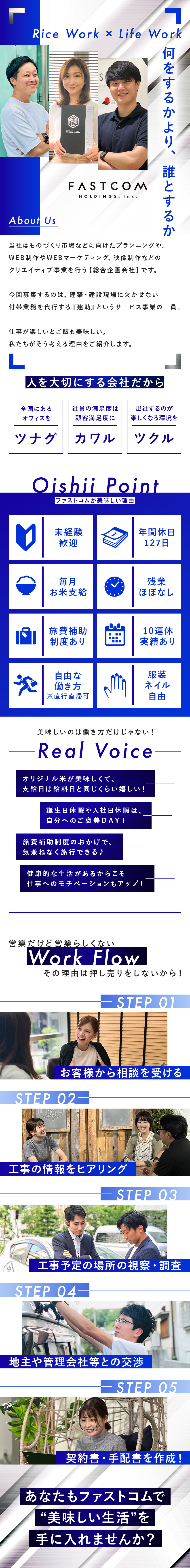 ファストコムホールディングスは、社員の「やりたい!」と社会の「ほしい!」を結びつける会社です。「働くって、こんなに面白いんだ」と感じられる瞬間が日常にある。建設現場を支える「建助」、職人文化を未来へつなぐ「ニッポン手仕事図鑑」、社会課題をデザインで解決する「クリエイティブ事業」などを展開。私たちは、いわゆる“きらびやかな最前線”ではなく 、社会の“かゆいところ”に手が届く仕事をしています。