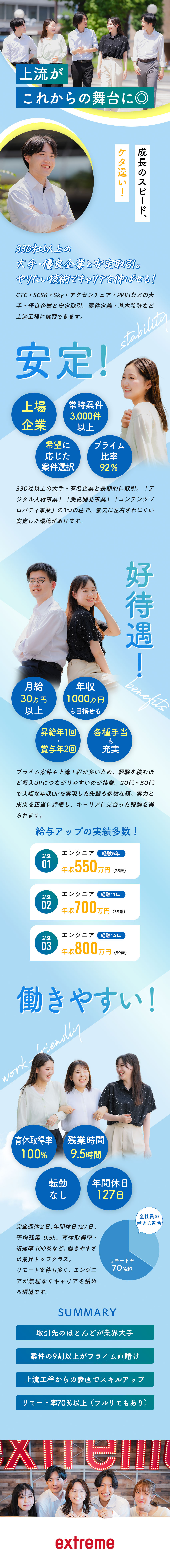 これまで何度も取材してきたエクストリーム社の魅力は、キャリアの幅広さと成長機会の多さにある。CTC、SCSK、Sky、アクセンチュア、PPIHなど330社以上の大手・優良企業と安定取引があり、Web・アプリ・クラウド・ゲームまで多彩なプロジェクトに挑戦できる。