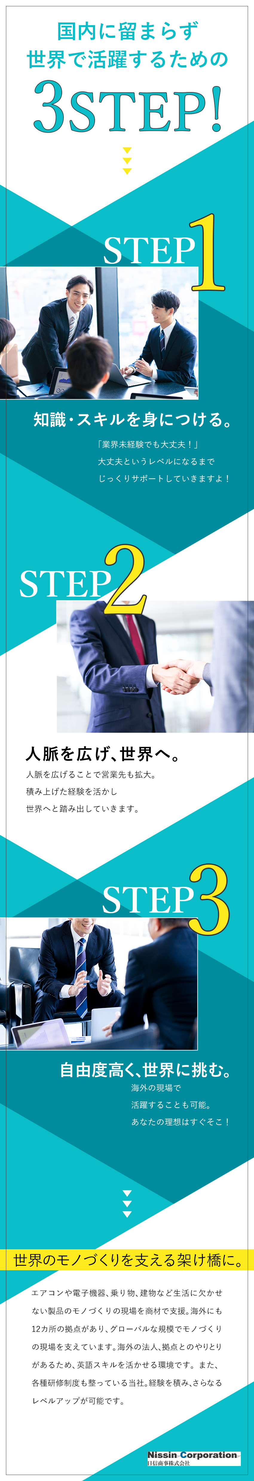 入社後は100%国内営業から人脈を広げ、営業として独り立ちした後は、世界を舞台に自身のアイデアを活かした活動が可能。
