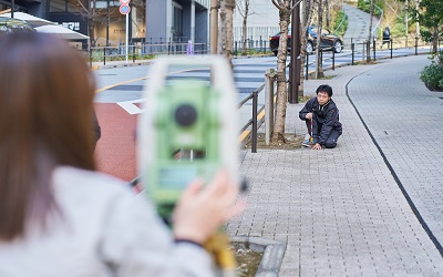 測量機械で図面作成に必要な数値を測定、実際の土地にズレがないかも確認。