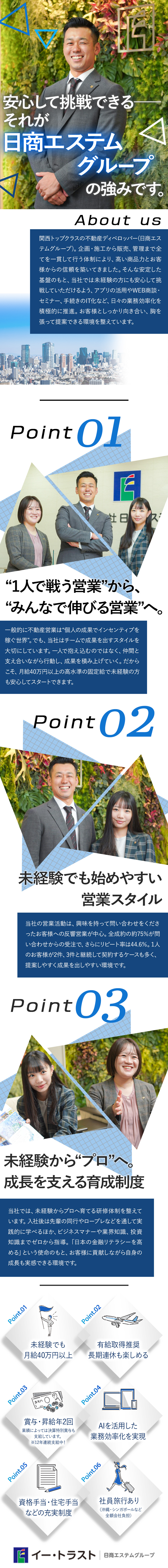 イー・トラストは、土地開発・販売・資産運用・リフォームなど「不動産の全て」を手がける日商エステムグループの一員。