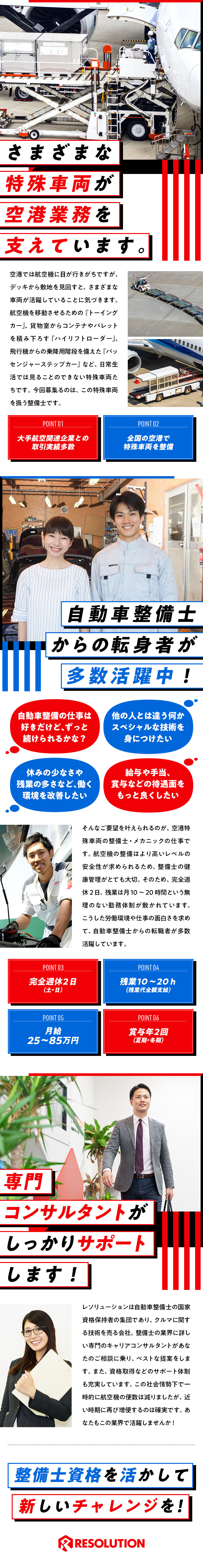 ◆整備士・メカニックなど、自動車業界に特化した人材サービス企業を展開し、これまでに累計3000社以上に対して人材を紹介してきたレソリューション。整備士一人ひとりの希望の働き方に耳を傾け、有名ディーラーや自動車メーカー、大手航空関連企業など幅広い職場の中からお仕事を紹介しています。