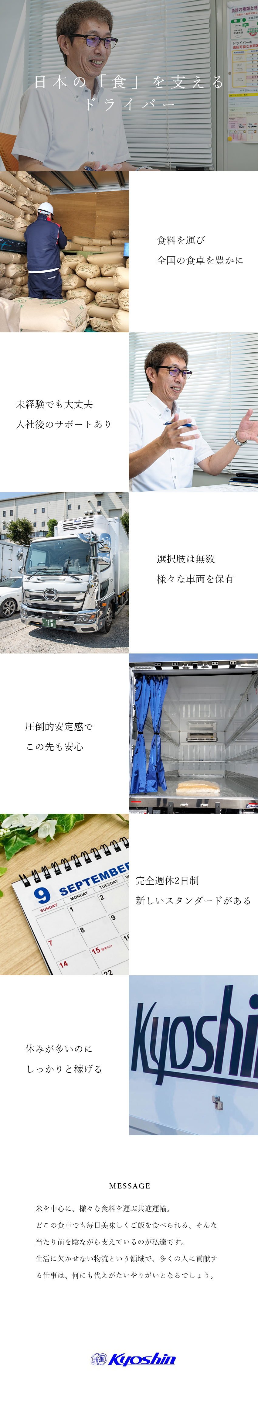 今回募集するトラックドライバーは、コメを中心に大手食品メーカーの冷凍商品など、食料品を中心に配送します。いわば、日本の食卓を物流から支えている私たち。多くの人の生活を支えるやりがいを感じられるポジションです。
