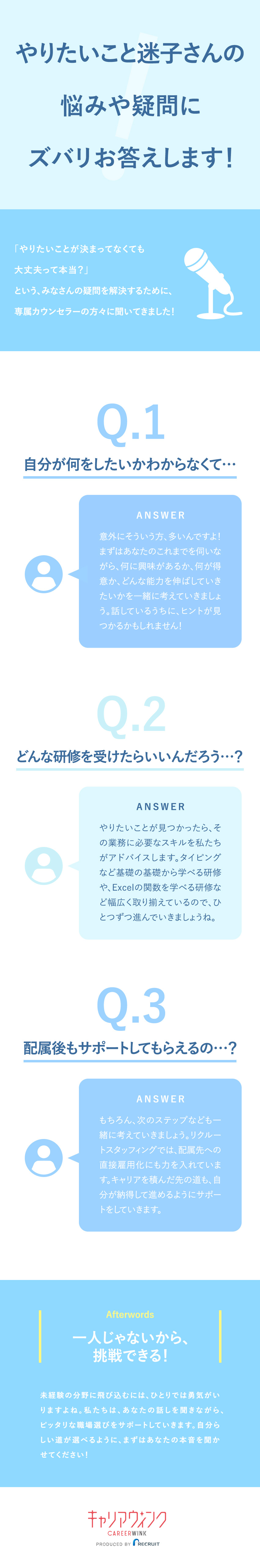 「キャリアウィンク」は株式会社リクルートスタッフィングから生まれた「未経験からの事務職へのチャレンジ」と「仕事とプライベートの両立」ができる働き方! リクルートスタッフィングの正社員(無期雇用派遣)として入社し、大手・有名企業の事務職として勤務します。