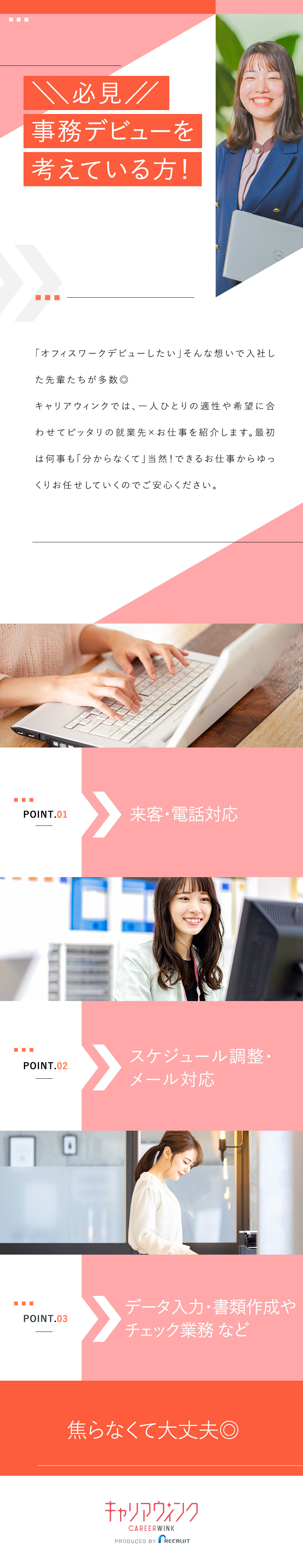 キャリアウィンクでは、「未経験からの事務職へのチャレンジ」と「仕事とプライベートの両立」が叶う働き方を手に入れることができます。 リクルートスタッフィングの正社員(無期雇用派遣)として入社し、大手・有名企業の事務職として勤務。就業前のパソコン・ビジネスマナー研修を通し、ゼロからしっかり学んでいけます。