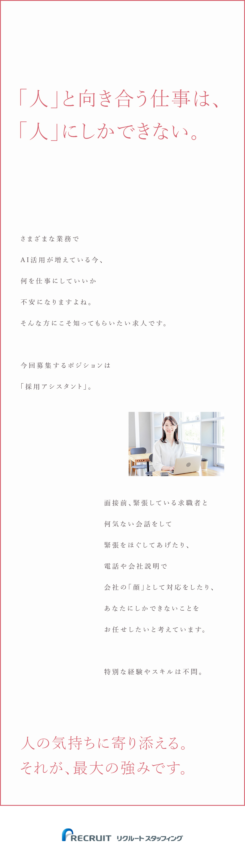 雇用主はあくまでリクルートスタッフィング。就業先では同社の看板を背負ってお仕事をするため、ときには責任感を感じることがあるかもしれません。