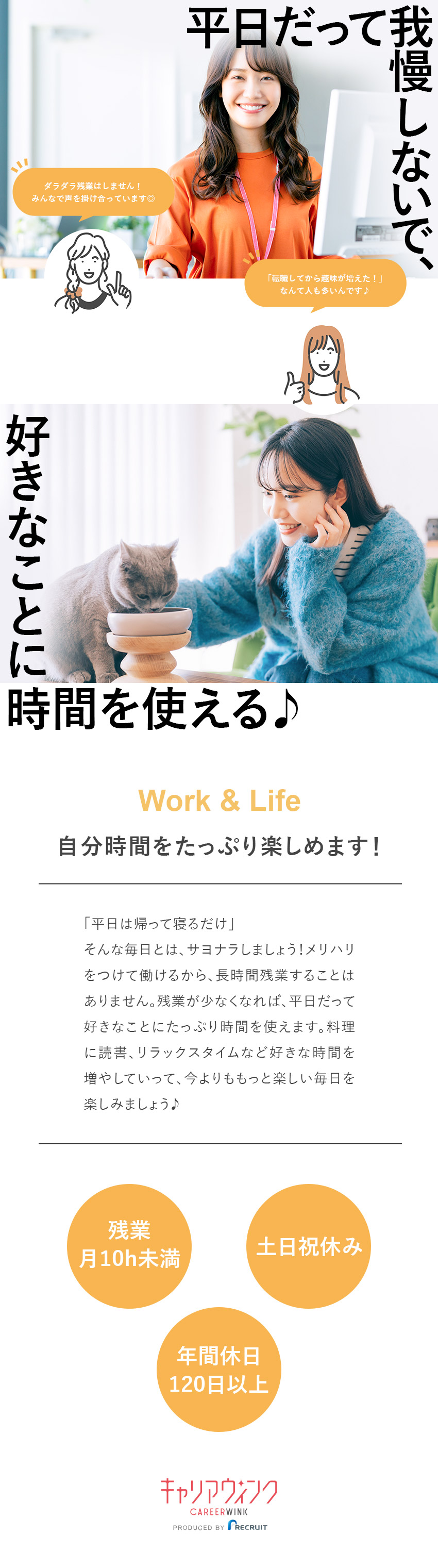 仕事だけではなく、プライベートも満足できる働き方が同社でなら叶えられます。