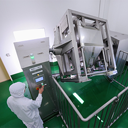 <写真:コンテナタンブラーでの作業>品質や安全性を担保し、安全安心な製品製造を行っています。