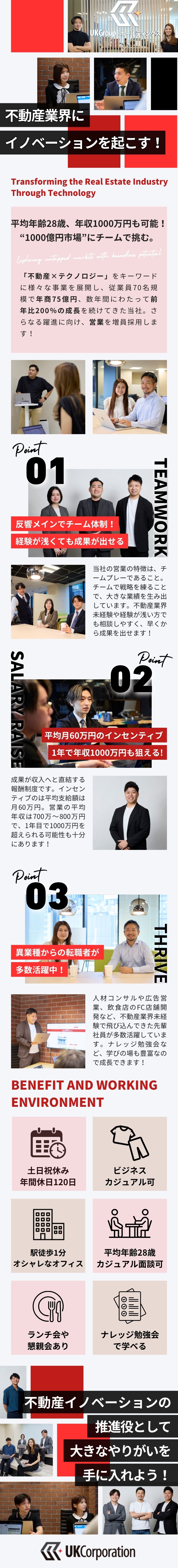 成果を最大限に還元する制度が整っています。チームに還元するインセンティブと、個人に還元する報奨金の2つの制度で頑張りが収入に直結するため、年収1000万円以上も珍しくありません。チームで成果を最大化するため、未経験者や社歴の浅い方でも早くから高収入を得られるのは同社ならでは!
