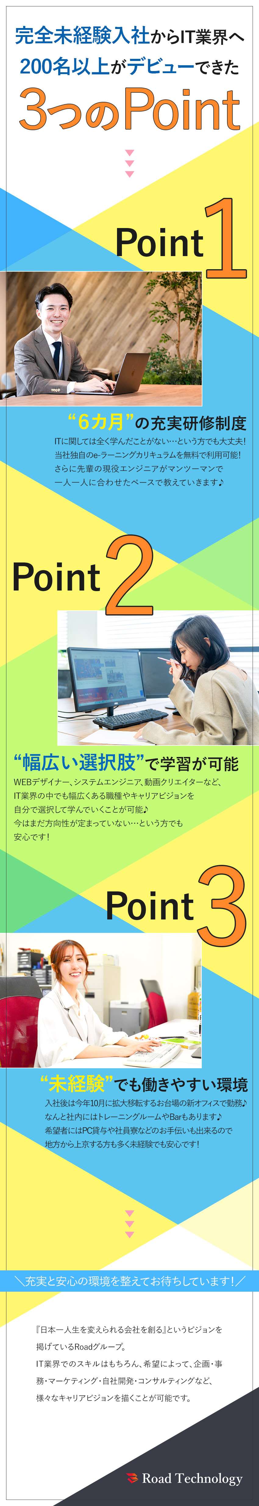 「日本一人生を変えられる企業を創る」をミッションに掲げるRoadグループは、社員育成に非常に力を入れています。6ヶ月の研修期間を設け、ITスキルだけでなくビジネススキルやコミュニケーション力などのヒューマンスキルも重視。AIの進化が目まぐるしい現代において、応用力や人間力を育て、“スキルがあるから任される”だけでなく、“アナタだから任せたい”と言われる、長期的に活躍できるIT人材を育成しています。また、グループとしてIT以外の事業展開も行っており、キャリアアップやキャリアチェンジの機会が豊富です。未経験から新しい業界に挑戦し、人生を変えたい方に、ぴったりの職場環境となることでしょう。