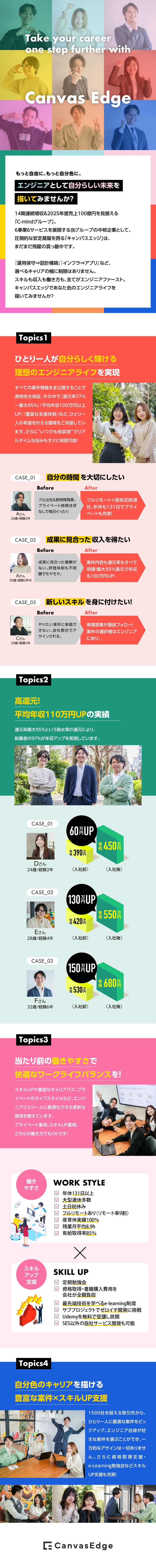 エンジニアの理想を追求するため、最大「95%」という高還元率で収入アップが狙える体制や、残業月平均「8.9h」以下というメリハリのある働き方を実現しています。
