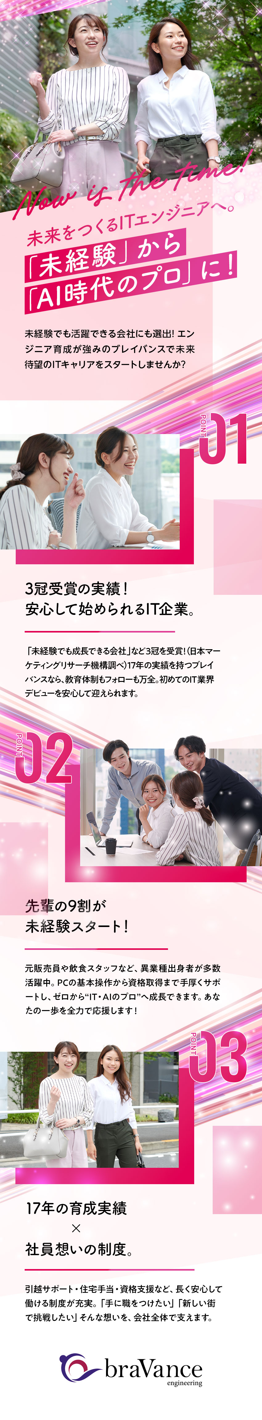 すでに17年実績があり安定した経営基盤がポイント。日本マーケティング・リサーチ機構調べの「未経験でも活躍できる会社」「頑張りをしっかり評価してくれる会社」「エンジニアとしてキャリアアップできる会社」にいずれもNo.1認定を受けるなど対外的な評価を得ていることにも注目です。