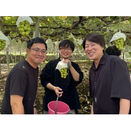 美味しそうなぶどうを手に、一枚。社内イベントは自由参加ですが、楽しんで参加している社員も多いです。