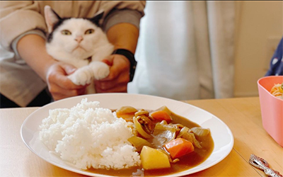 実際に活躍している社員いわく、「この間は新入社員監修のもと、皆でカレーを手作りして食べました。手を合わせているのは元・保護猫のバンくん。あたたかいものを社員全員で揃って食べられるので、自然と雰囲気も和やかなものになります」とのこと。
