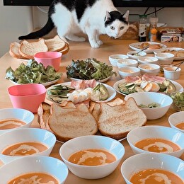 週に数回、交代制でつくる「まかにゃい」。猫のアツい視線を横目に、みんなで手を合わせていただきます!