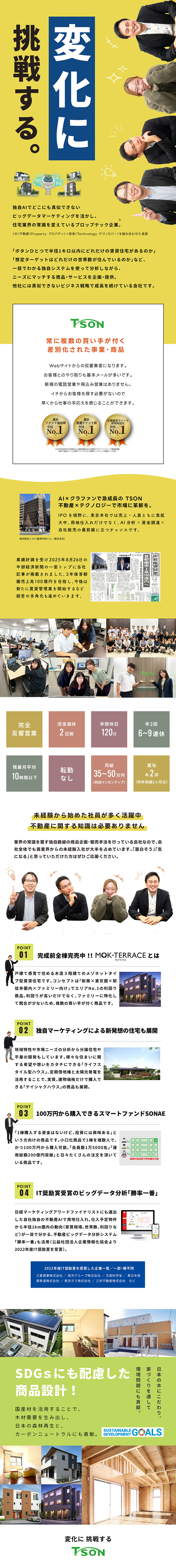 株式会社TSON(ティーソン)は、独自の不動産AIでどこにも真似できないビッグデータマーケティングを活かし住宅業界の常識を変えている会社です。これまで培ってきたマーケティング手法とデータを活かしたコンサルティングや広告プロモーション等の事業を通じ、より良い住まいを提供することで社会の発展に貢献しています。