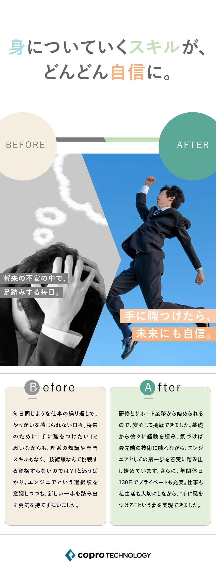 また、働く環境面も大きな魅力。年間休日は130日、完全週休2日制で、転勤の心配もありません。上場企業グループならではの安定感に加え、成長分野に関わるやりがいがあり、長期的にキャリアを築く土台が整っています。