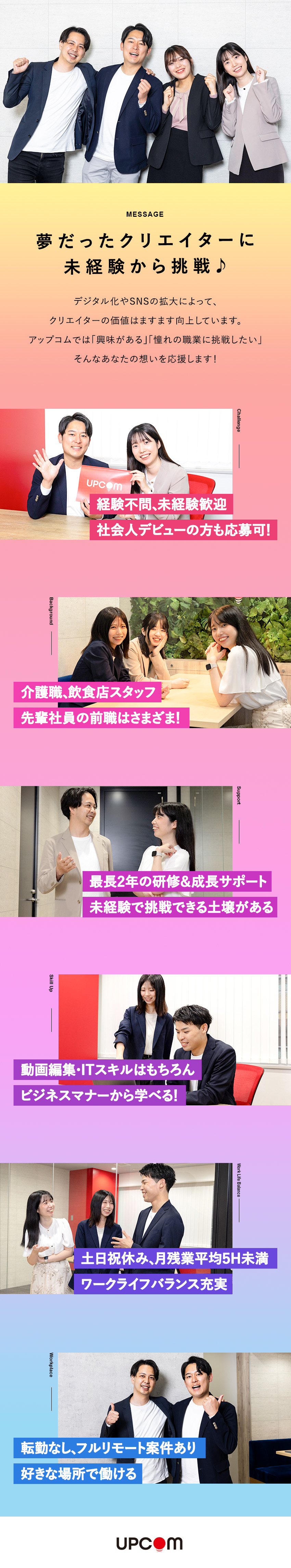 デジタル映像のクリエイター育成に力を入れてきたアップコム。業界からの期待とニーズは高まり続けています。そんな期待に応えるため、動画制作体制を強化する新しい専任チームを発足。今回は、そこで一緒に活躍するクリエイターを募集します。
