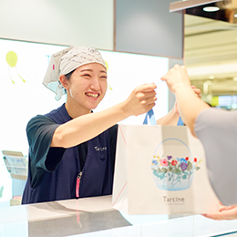 「このお菓子が好き!」と、遠くから足を運んでくださるお客様も。季節やイベントごとにお店はにぎやかになり、スピーディさと丁寧さ、どちらも大切にしながら働いています。