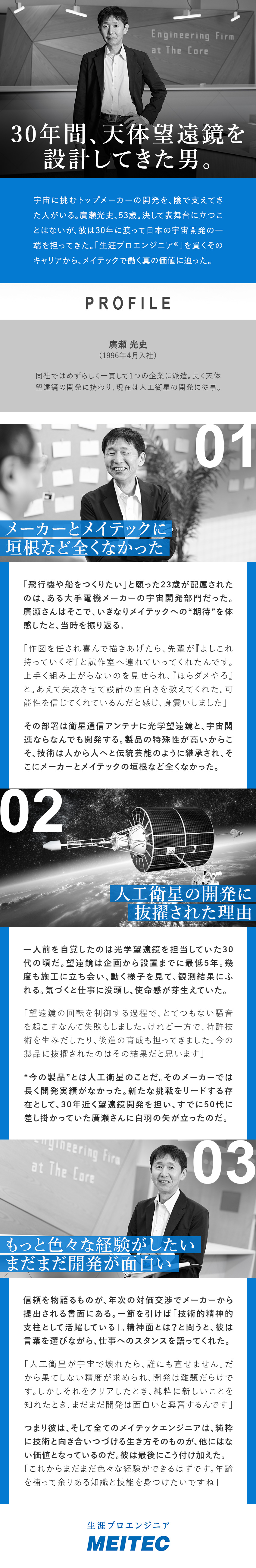 宇宙開発という新たな課題を前に、技術者派遣各社への依頼が活発だ。大手メーカーも宇宙ベンチャーも、経験豊富なエンジニアの確保を急いでいる。そんな中、第一想起されるのがメイテックだという。その理由を営業担当はこう語る。