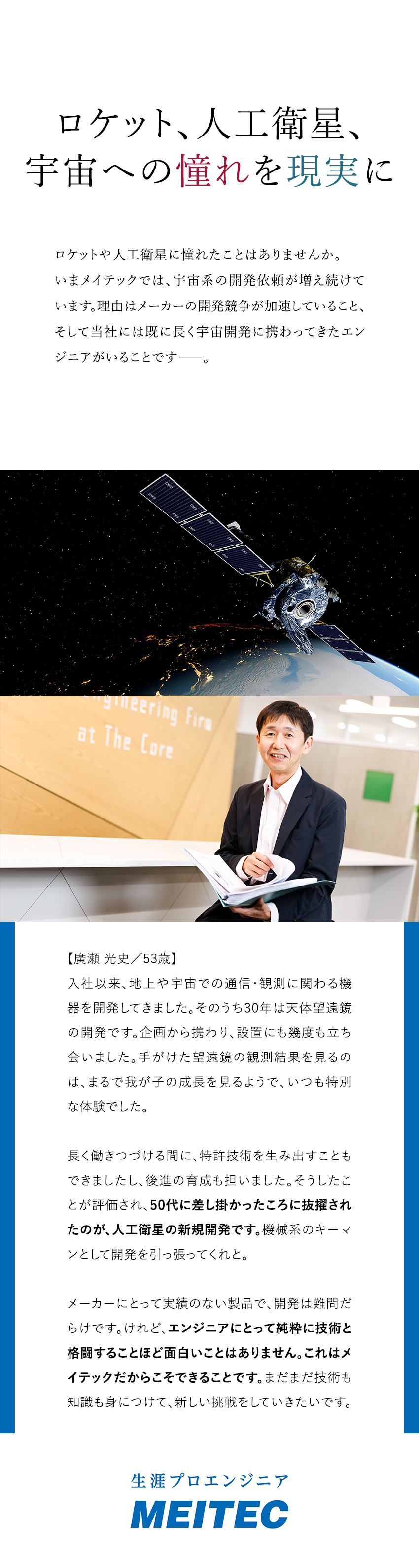 宇宙機器開発という新たな課題を前に、技術者派遣各社への依頼が活発だ。大手メーカーも宇宙ベンチャーも、経験豊富なエンジニアの確保を急いでいる。そんな中、第一想起されるのがメイテックだという。その理由を営業担当はこう語る。