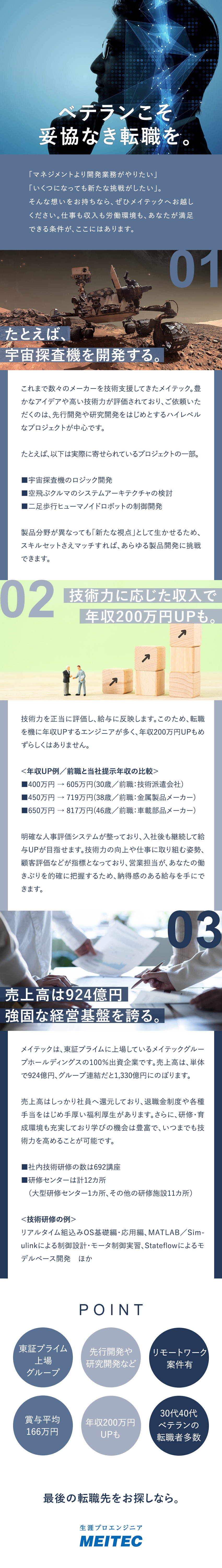 魅力的なプロジェクトで、どっぷりものづくりに熱中できる。そうした働きがいがあることに加え、評価も明確であることが、メイテックが多くのエンジニアに選ばれる主な理由です。