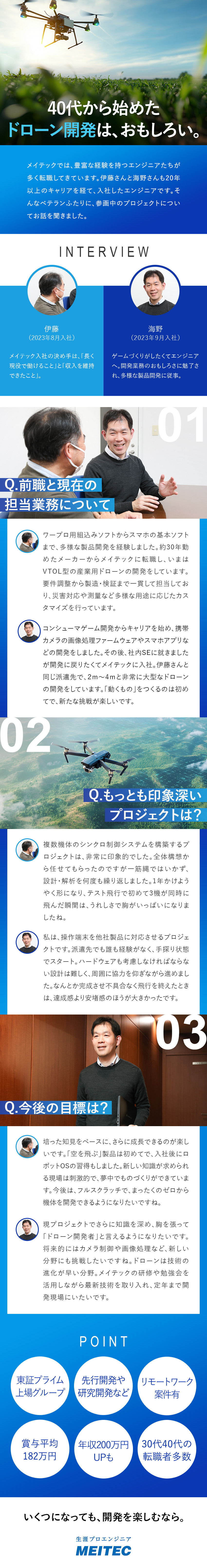 メイテックには、大手メーカーやベンチャーなど多様なものづくり企業から多くの依頼が寄せられています。しかも、どのプロジェクトもハイレベルなものばかり。先行開発や研究開発への挑戦も可能で、年数を重ねてもいつでも夢中になれる仕事ができます。