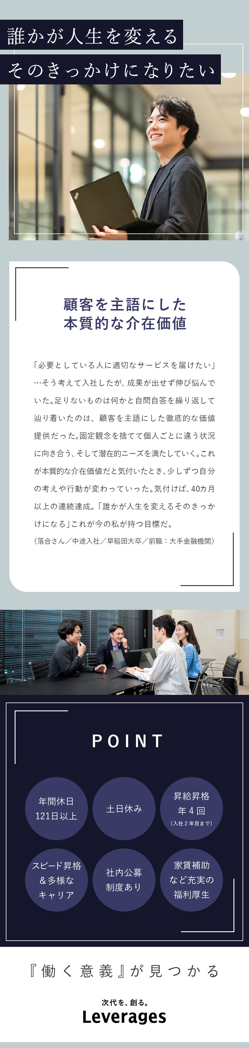 レバレジーズの事業は、全て社会課題にフォーカスして立ち上げられたものです。そのため、自分が営業として成果を上げることで、社内外の関係者から感謝され、結果的に自分自身の評価にもつながるというサイクルが生まれ、全員の感情にプラスに働きます。