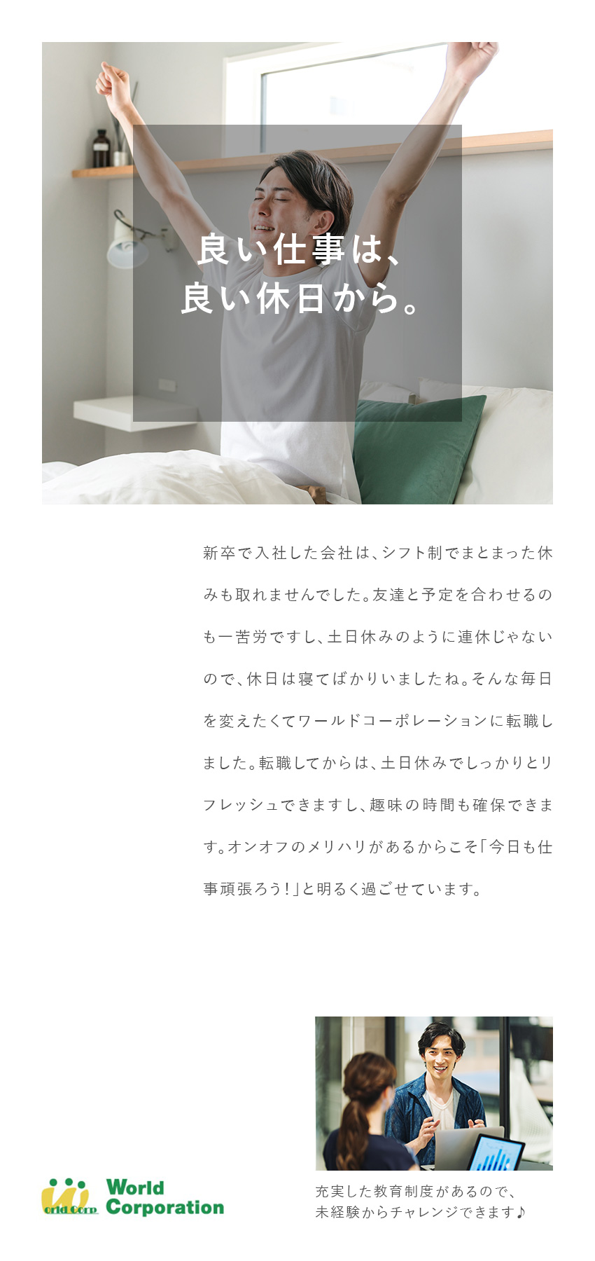 私たちワールドコーポレーションが重視しているのは、面接に来てくれた方の「将来を一緒に考えて、どうすれば良いキャリアが築けるか見つけること」です。 どのようなキャリアを磨いていけばちゃんと将来設計ができるのか、ワールドコーポレーションの中でどういった成長をすればスキルが身につくのかなどを、人事ならではの視点で丁寧にお教えし、あなたが納得する未来を一緒に考えていきます。