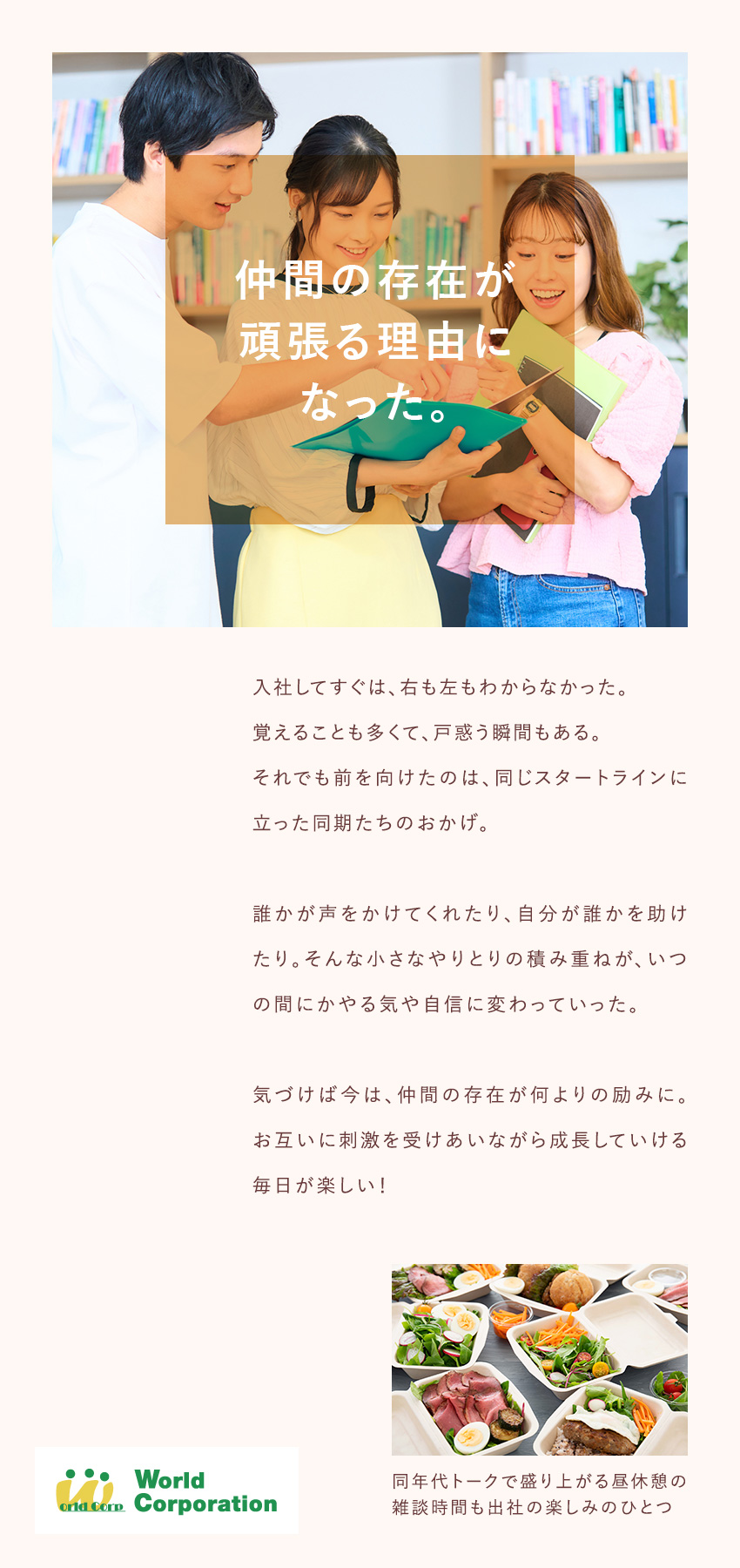 私たちが重視しているのは、面接に来てくれた方の「将来を一緒に考えて、どうすれば良いキャリアが築けるか見つけること」です。 どのようなキャリアを磨いていけばちゃんと将来設計ができるのか、ワールドコーポレーションの中でどういった成長をすればスキルが身につくのかなどを、人事ならではの視点で丁寧にお教えし、あなたが納得する未来を一緒に考えていきます。