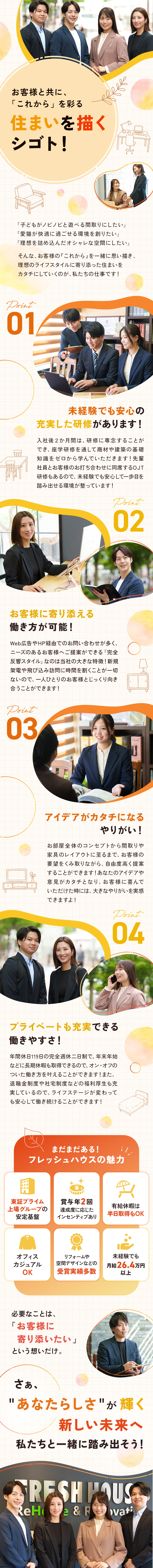 完全反響でお客様に寄り添いながらプランニングに集中できる同社だからこそ、『誰かのために』が原動力となる方には、ぜひご応募いただきたいポジションです!