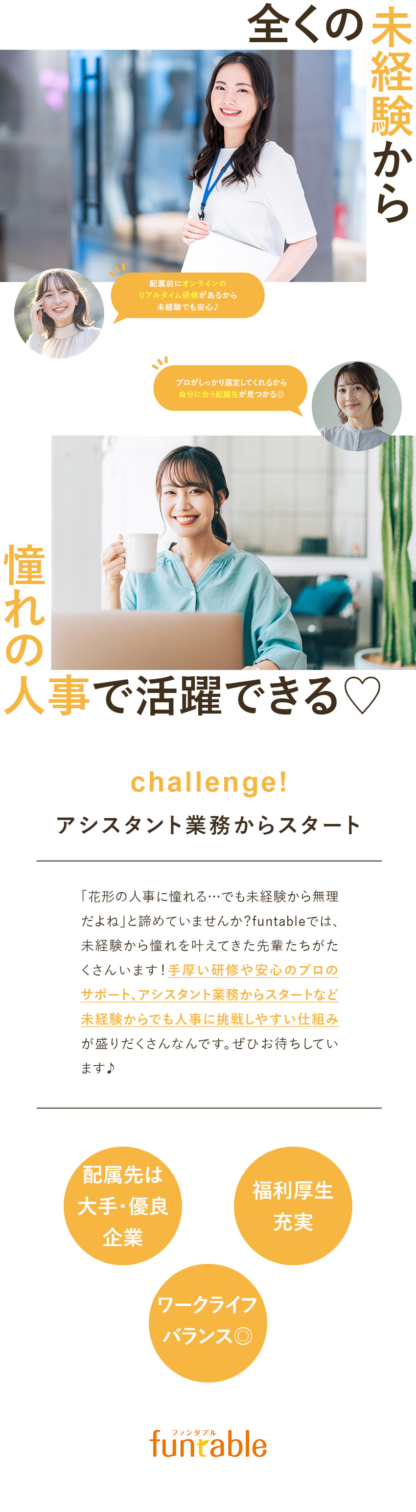 人事のお仕事に興味はあるけれど「経験がないから不安…」という方も大丈夫です!funtableの人事アシスタントは、大手・優良企業で働ける安心の環境に加えて、研修やプロのサポートがしっかりあるのでゼロから挑戦ができます♪お任せするのは採用や労務の事務周りのサポートが中心。少しずつできるところから業務をスタートしていきましょう。