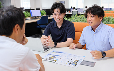 業界未経験、営業未経験の社員も活躍できるのは、チームでフォローし合う体制が整っているから。困ったことやわからないことがあれば、上司や先輩はもちろん、同僚とも相談できる環境です。