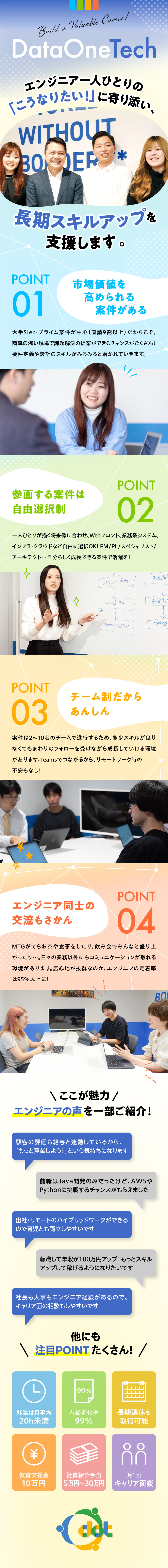 人事担当も、もともとはJavaの開発エンジニアとして品質管理・テストの経験してきた人物だとか。技術畑出身の視点で考えられる人物が経営と採用・キャリア支援を行っていることから、スキルアップやキャリア形成、ワークライフバランス等においても、エンジニアファーストの環境で働けるのが魅力。経験を活かしたい人も、これから価値を高めていきたい人も、一緒に考えながら将来像を描いていける会社です。