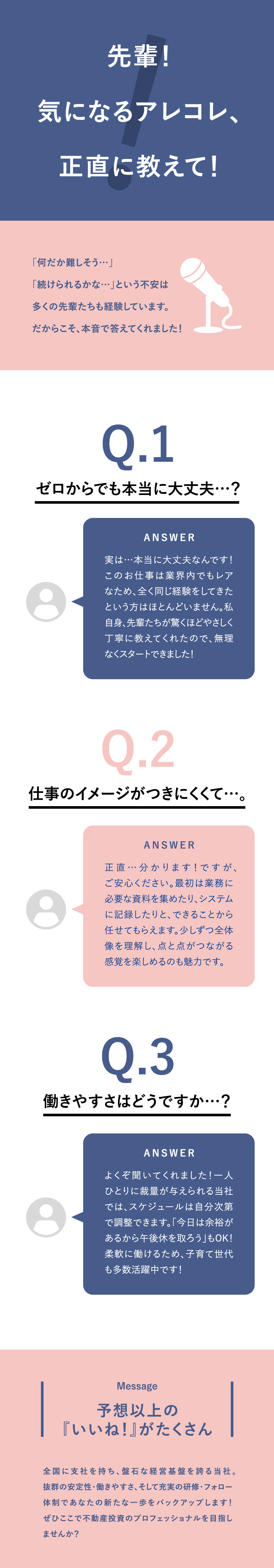 将来性のある事業だからこそ長期キャリアを見据えることができ、その中で会計知識や不動産の専門知識を身につけ、キャリアアップを目指せるのがポイント。自分自身を高めたい方にはまさにピッタリです。