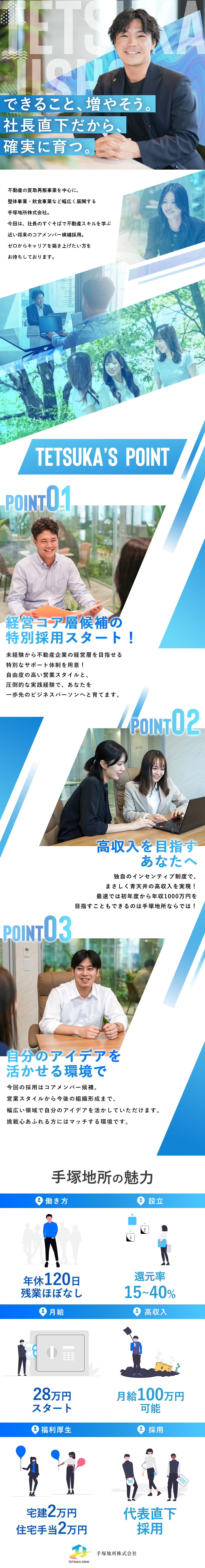 手塚地所株式会社は、多角的な事業をユニークに拡大しています。不動産事業のほか、整体や飲食といった異業種にも挑戦し、社員が多角的に成長できる環境を整備。中でも今回配属となる不動産事業においては、「売って終わり」ではなく、お客様がいつでも安心して相談できる存在でありたいという社長の想いのもと、誠実な姿勢を武器に事業拡大。そんなチームのコアメンバーとして、未経験から不動産キャリアを築きながら、挑戦しやすい体制や手厚いサポートを受けられます。「未来の自分を変えたい」「自分の力で新しい事業を創り上げたい」という方に最適なフィールドが広がっています。