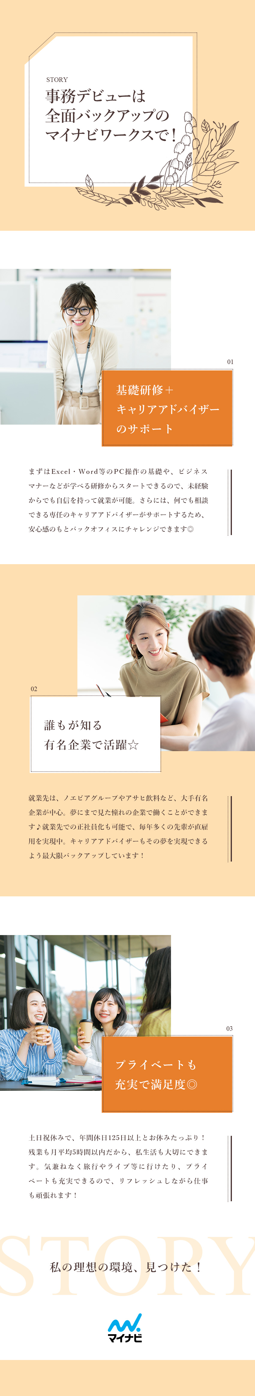また、ゆくゆくは就業先企業での正社員化も可能。キャリアアドバイザーのサポートを受けながら、自分の夢を実現できるのはマイナビワークスならではのポイントです。