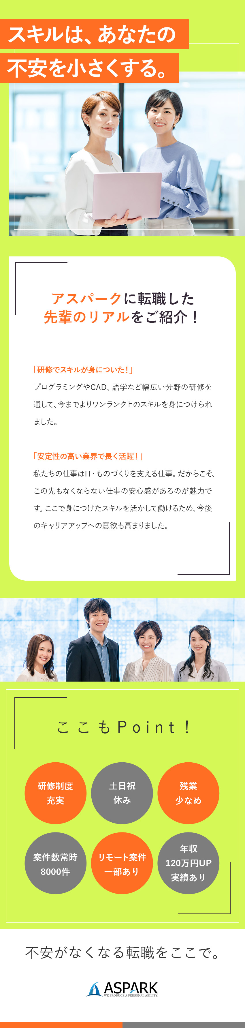 大手企業を中心に取引先が順調に増えており、ものづくりに関するプロジェクトは常に8000件以上!そのため、スキルを磨きながら将来的にキャリアチェンジも可能です。