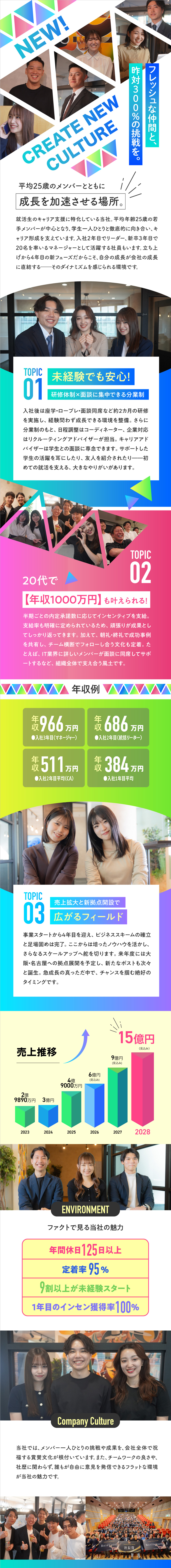 事業スタートから4年目を迎え、サービス拡充も進み体制は整いました。今期は更なる飛躍のチャンス。大阪・名古屋への拠点展開もすすめ、新たなポストも生まれます。ぜひ一緒にこの成長の機会を掴んで欲しいです。