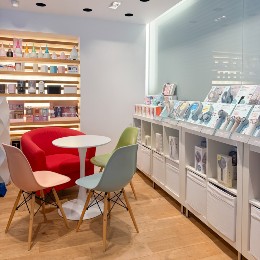 社内の写真。当社の人気商品が並ぶこちらのスペースは、打ち合わせや社員の休憩に使用されています。