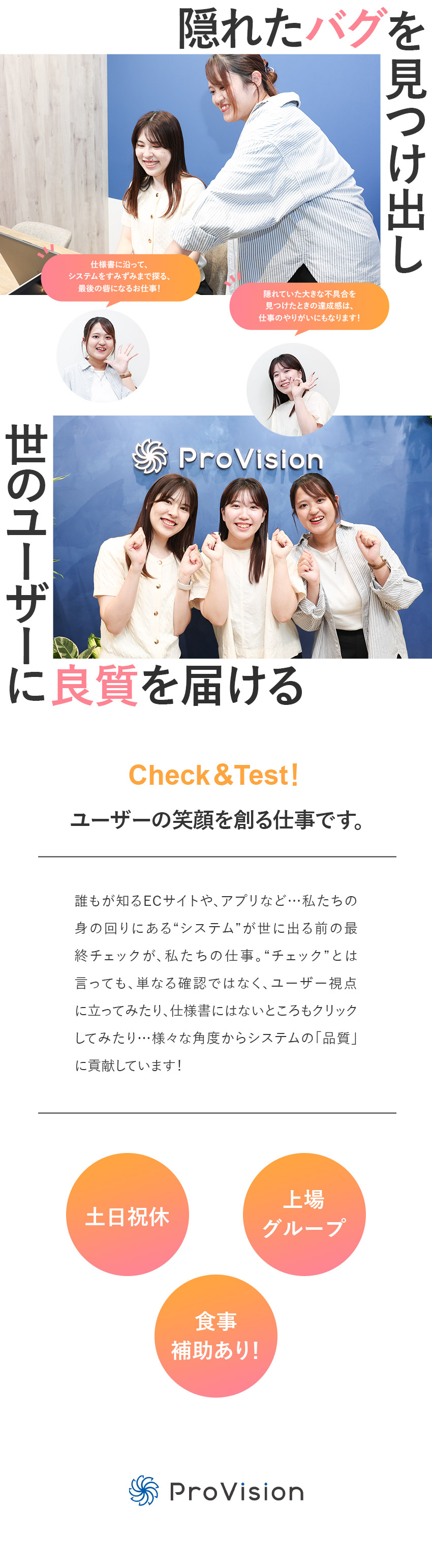私たちの生活に身近なECサイトやアプリなどに携わるため、日々仕事の価値を実感できることがこのポジションの特徴!だからこそ、開発チームも見逃していた大きなバグを見つけた時の達成感は大きいのだとか。サービスと密に関わりながら「社会に品質の良いものを提供する」責任感と面白さを感じることができます!