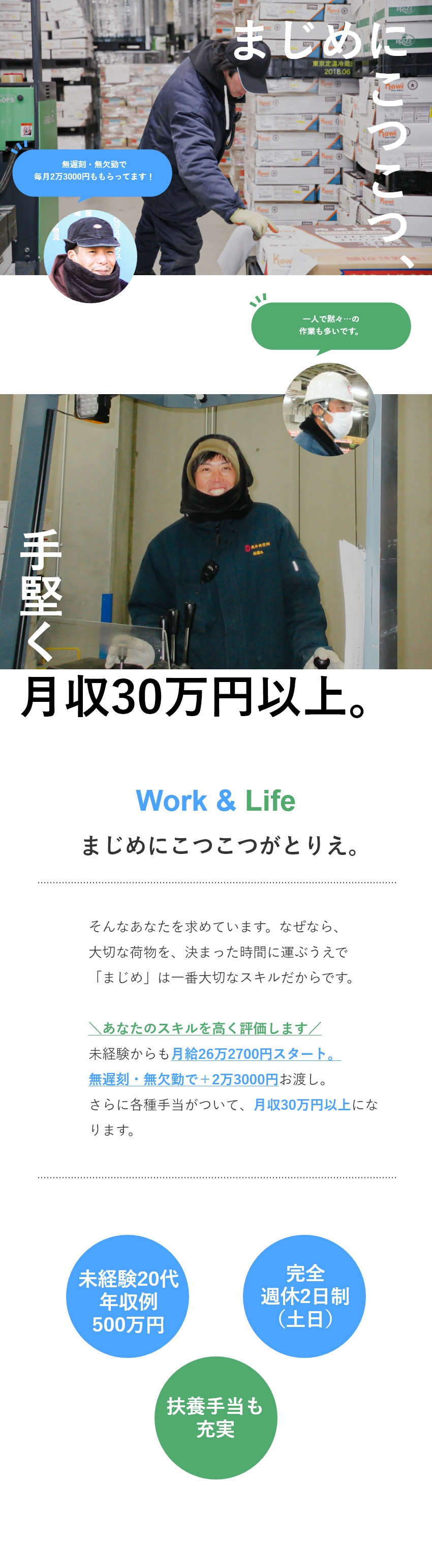 フォークリフトを使ってさまざまな商品の入出庫をおこなうこの仕事は、経験を積めば積むほどスキルに磨きがかかるという職人的な要素があります。そのため、社歴を重ねるごとに月収や賞与が増えていくことが特徴。