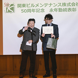 『永年勤続表彰』の授賞式の様子。社員同士で頑張りをしっかりと評価しています。