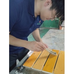 自分でも塗料を塗ってみて、使い心地や木材の変化を確認!製品を知ることが営業の第一歩です。