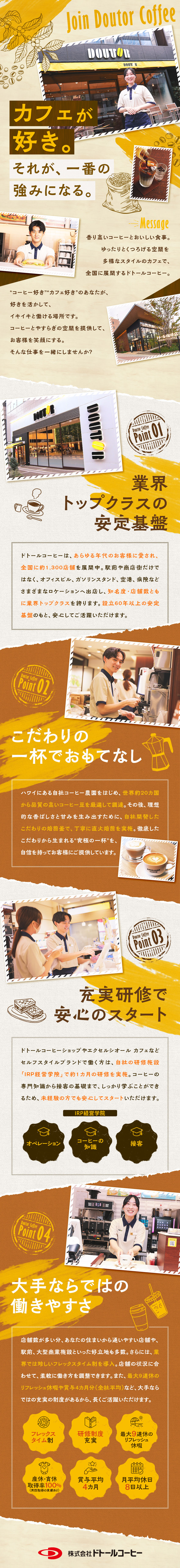 コーヒーが好きでよく喫茶店に行っていたのですが、ドトールのコーヒーが非常においしく興味を持ったのがきっかけ。丁寧な接客をしてくれたという記憶も強く、そんなドトールの一員になりたいと思って入社しました。