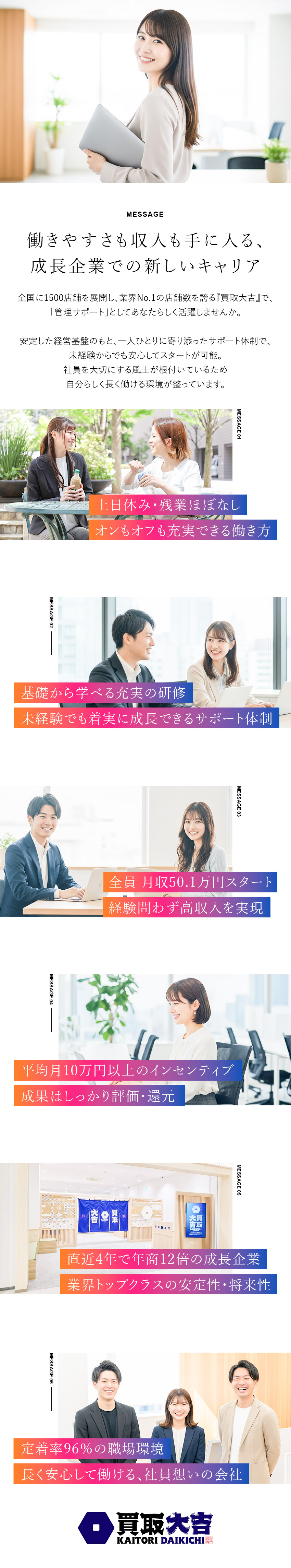 本社内勤【FC加盟店サポート】特別手当で月給50万超◆リユースで急成長の『買取大吉』/土日休/残業少