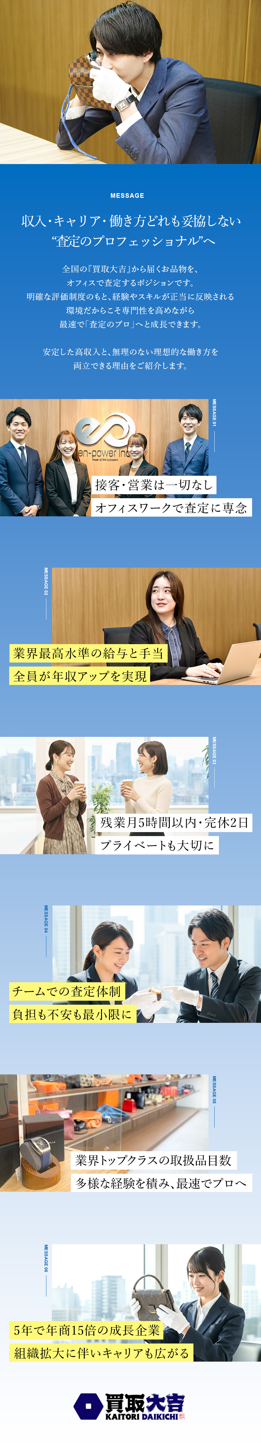 ◆幅広い商材を扱うため、得意分野以外も含めた知識・真贋スキルを向上させられます。複数名体制での査定により、意見を交わしながら互いに成長できる環境です。